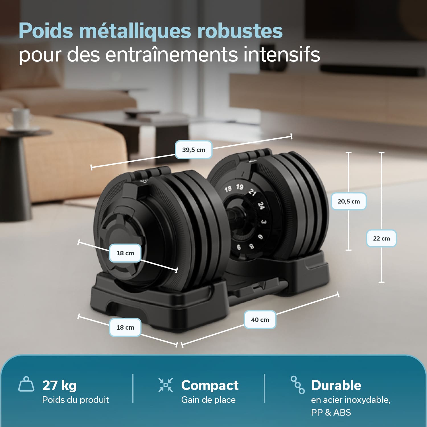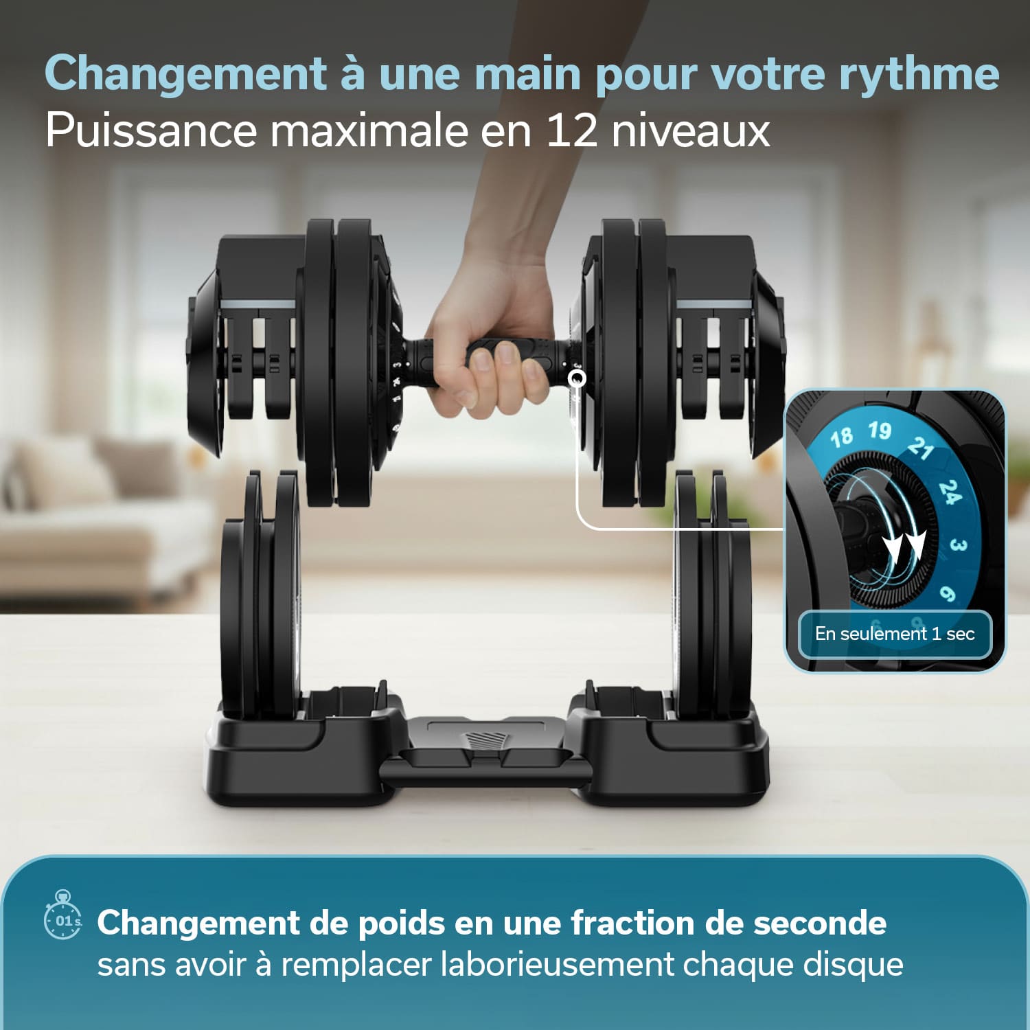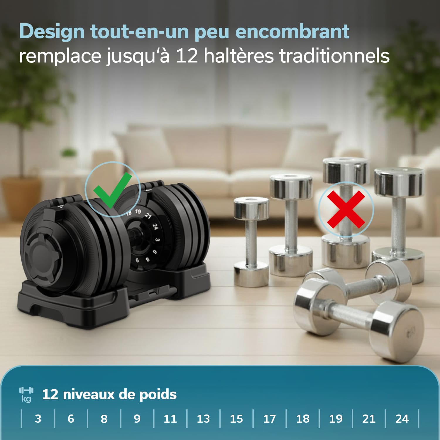 - Haltère réglable avec 12 niveaux de poids de 3 kg à 24 kg pour un entraînement musculaire progressif