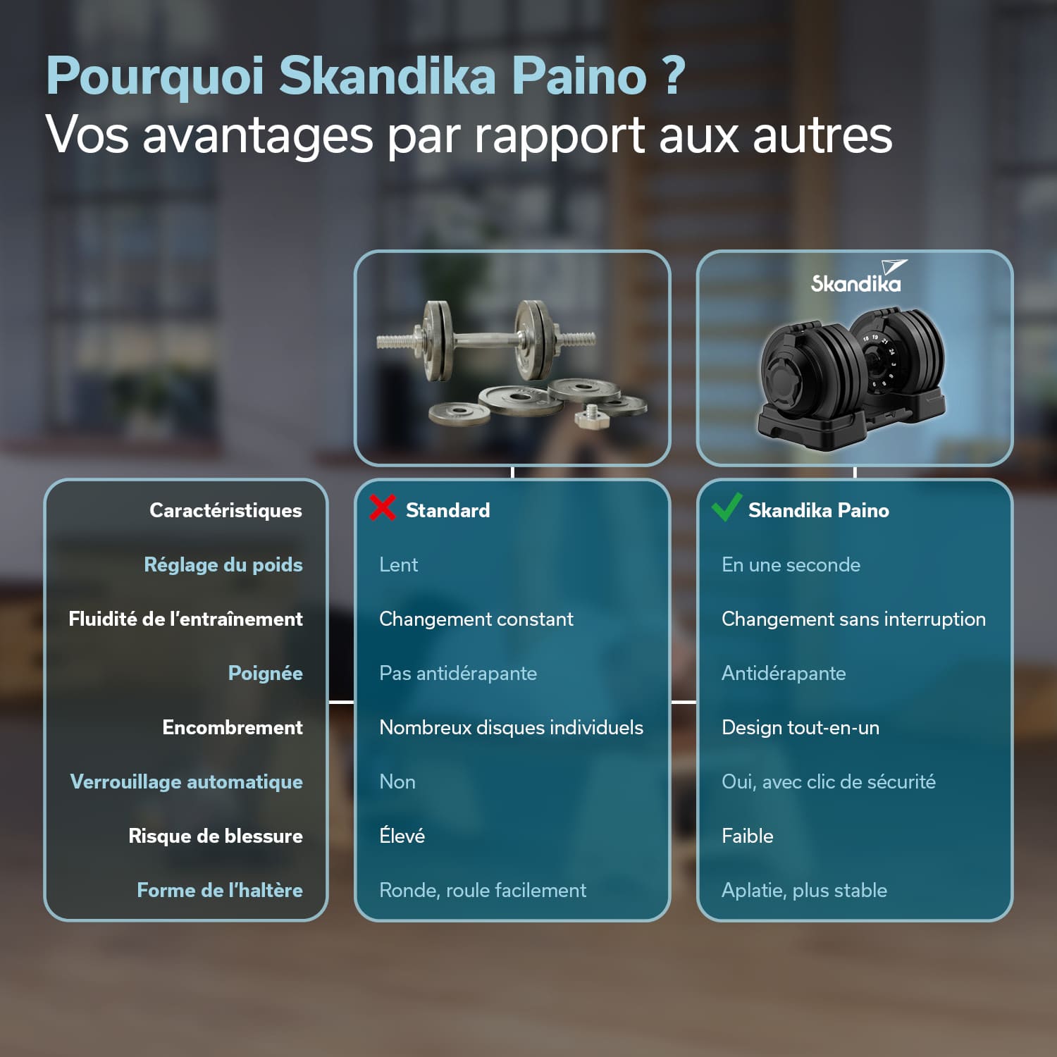 Avec le Skandika Paino, votre salle de sport à domicile s'enrichit d'un haltère réglable qui séduit par son système de changement rapide innovant et son design tout-en-un peu encombrant. Il combine douze niveaux de poids allant de 3 à 24,0 kg dans un seul appareil d'entraînement compact et permet ainsi de nombreux exercices pour les débutants comme pour les utilisateurs avancés. Le système intelligent de verrouillage automatique facilite le changement de poids et garantit des entraînements efficaces sans interruptions inutiles.
