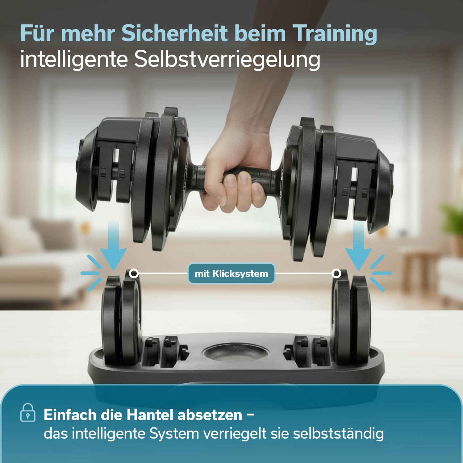 Le système innovant de verrouillage automatique permet de changer le poids en quelques secondes. Il suffit de positionner l'haltère sur le support, de régler le poids souhaité à l'aide de la poignée rotative et les disques correspondants s'enclenchent automatiquement.