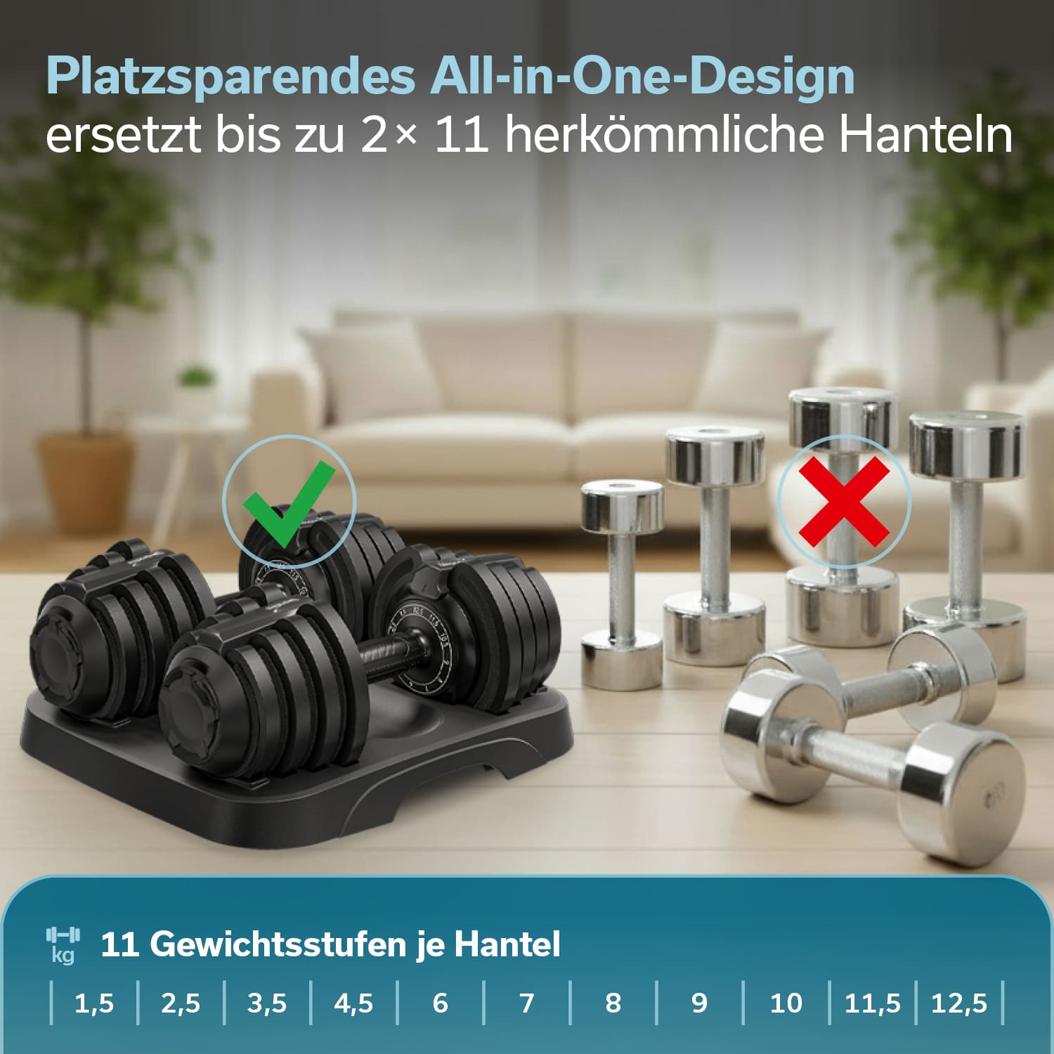 - Ensemble d'haltères réglables avec 11 niveaux de poids par haltère de 1,5 à 12,5 kg pour un entraînement de musculation flexible à domicile