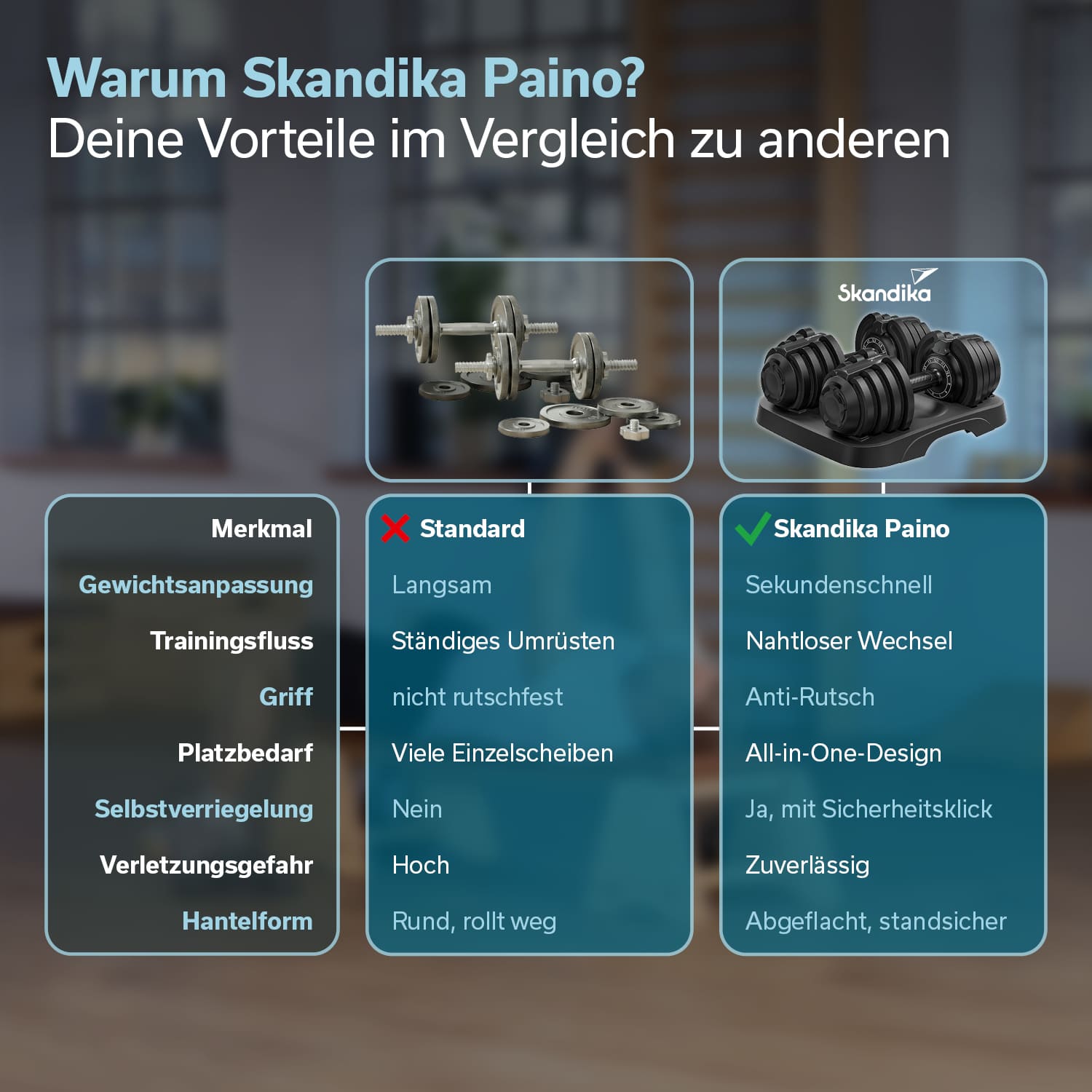 Avec une plage de poids comprise entre 1,5 et 12,5 kg, le set d'haltères Paino convient aussi bien aux débutants qu'aux sportifs expérimentés. Il évolue avec le niveau de performance et reste un partenaire d'entraînement précieux à long terme.