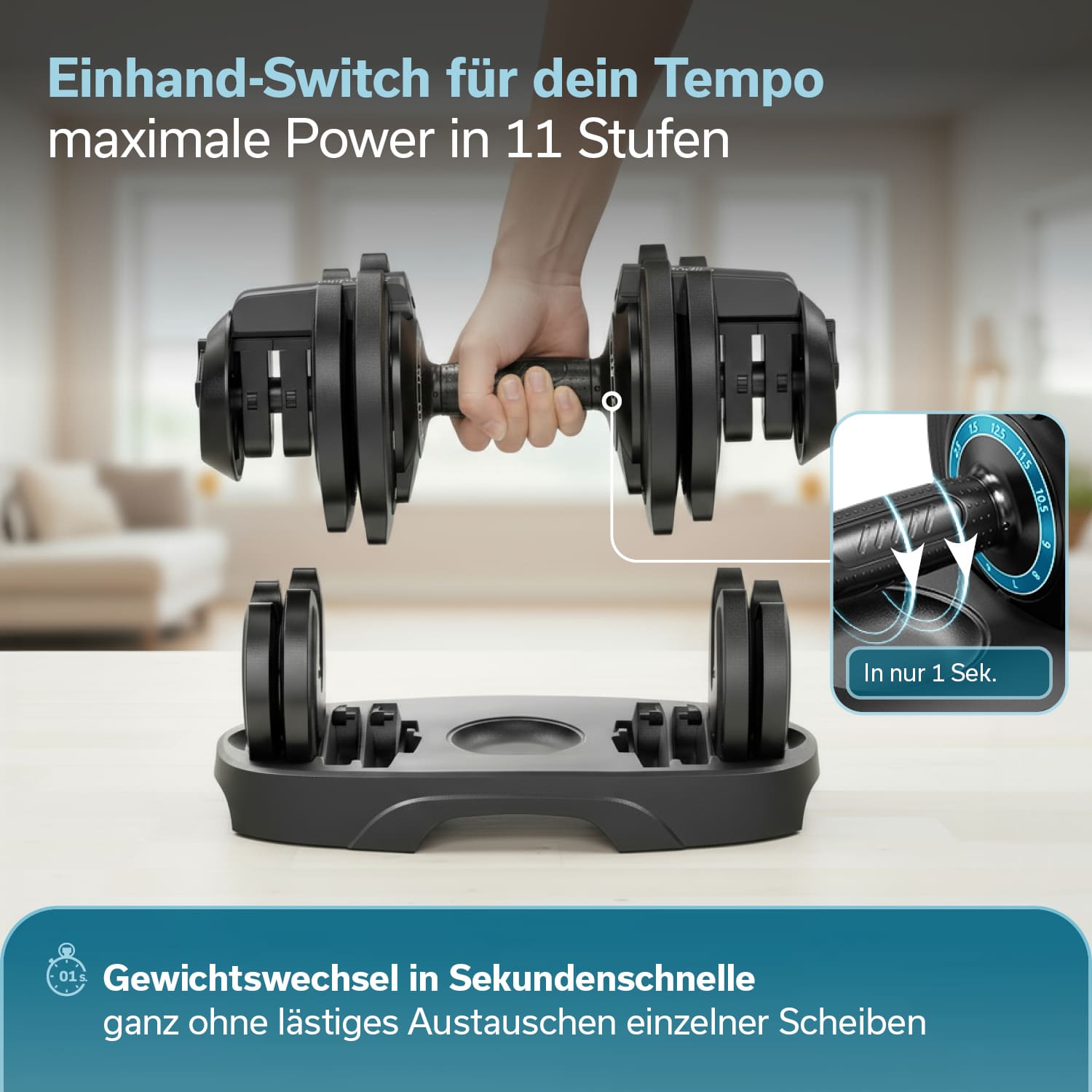 Deux haltères réglables avec onze niveaux de poids chacun offrent une variété d'entraînement maximale et permettent un entraînement de force individuel pour les deux bras – idéal pour une sollicitation musculaire symétrique et ciblée.