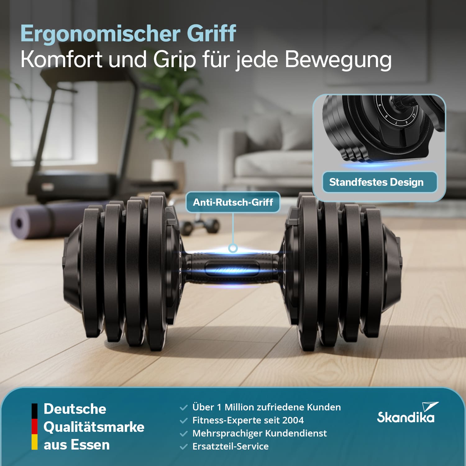 Avec le set d'haltères Paino de Skandika, vous disposez dans votre salle de sport à domicile d'une paire d'haltères réglables qui séduit par son système de changement rapide innovant, son design tout-en-un peu encombrant et sa flexibilité maximale. Deux haltères avec onze niveaux de poids chacun permettent un entraînement de musculation individuel et progressif, idéal pour les débutants et les utilisateurs avancés qui apprécient le confort et la polyvalence. Le système de verrouillage automatique intelligent facilite le changement de poids et garantit des entraînements efficaces sans interruptions inutiles.