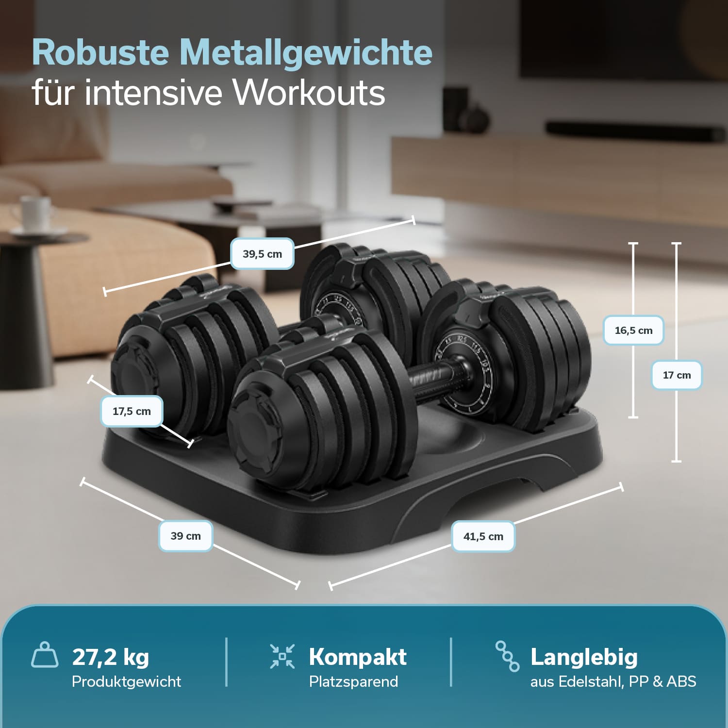 - Dimensions par haltère : 39,5 × 17,5 × 16,5 cm, dimensions totales avec support : 41,5 × 39 × 17 cm