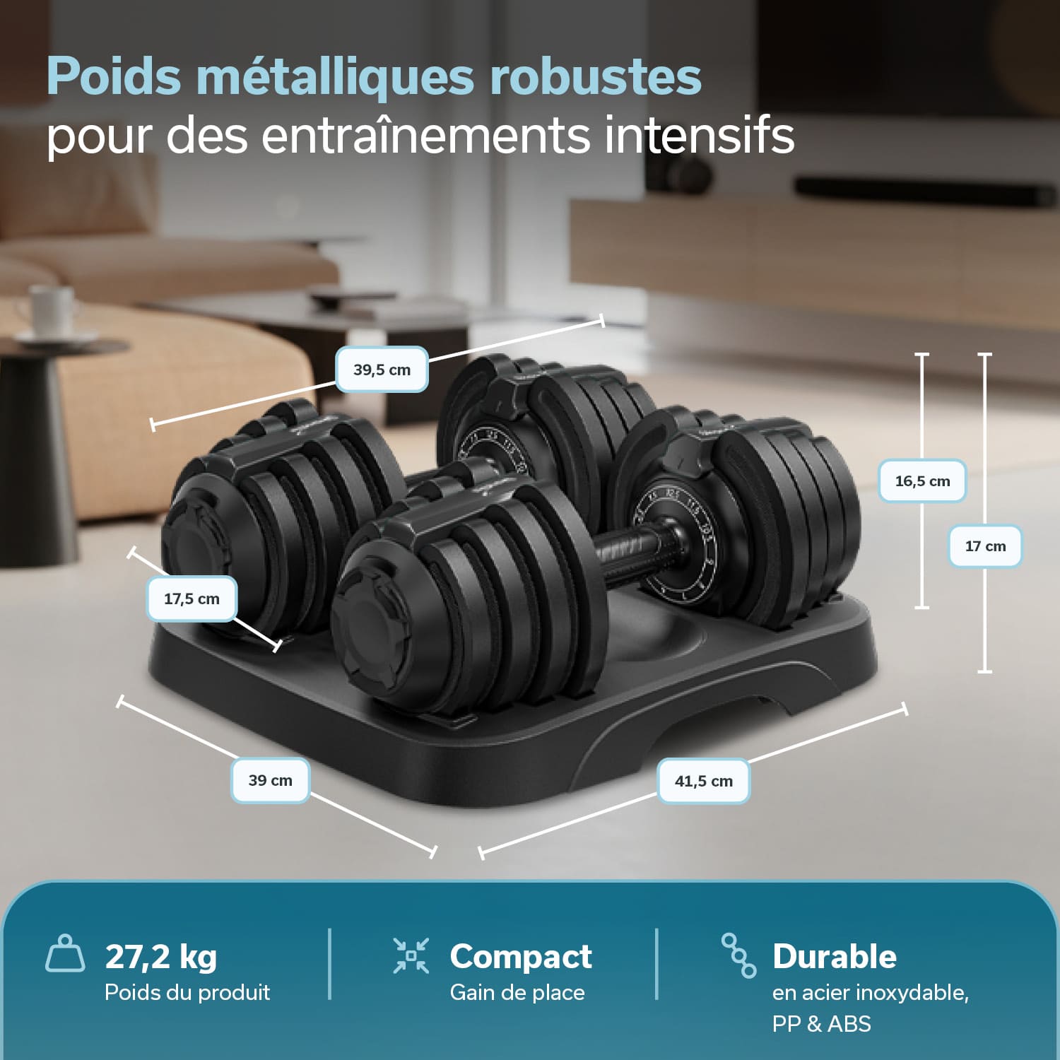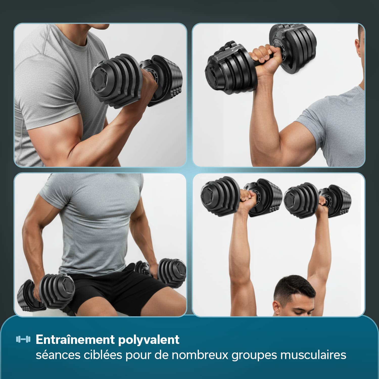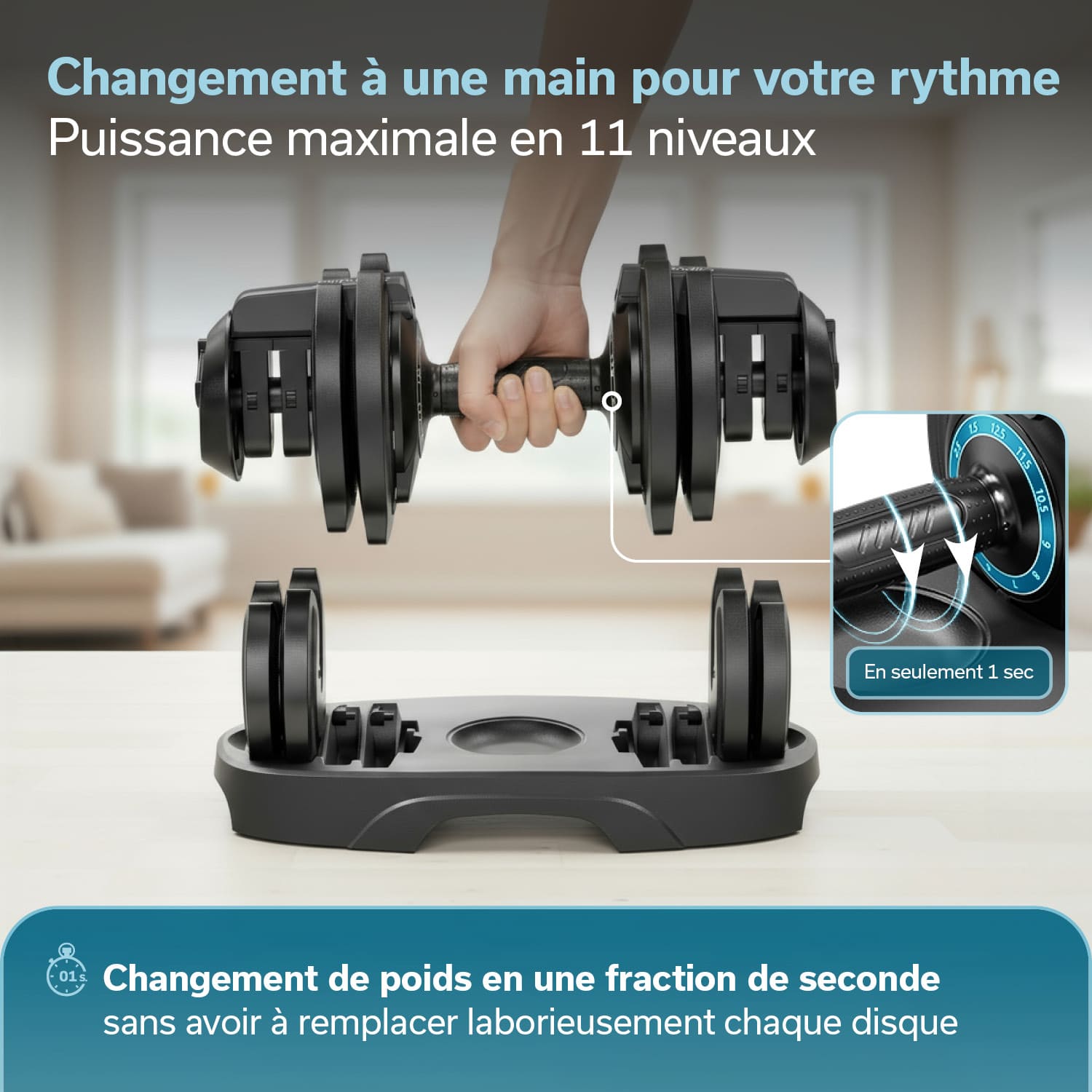 - Ensemble d'haltères réglables avec 11 niveaux de poids par haltère de 1,5 à 12,5 kg pour un entraînement de musculation flexible à domicile