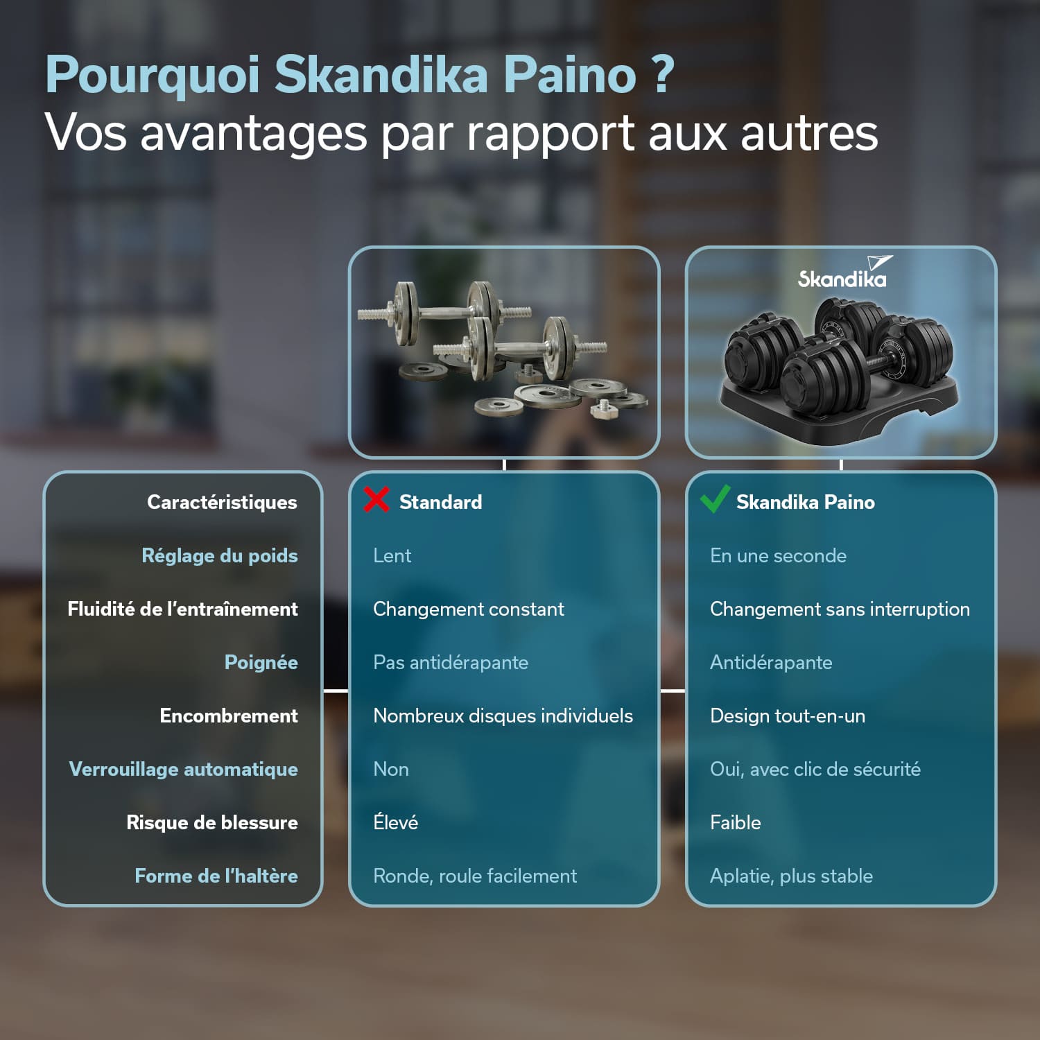 Avec le set d'haltères Paino de Skandika, vous disposez dans votre salle de sport à domicile d'une paire d'haltères réglables qui séduit par son système de changement rapide innovant, son design tout-en-un peu encombrant et sa flexibilité maximale. Deux haltères avec onze niveaux de poids chacun permettent un entraînement de musculation individuel et progressif, idéal pour les débutants et les utilisateurs avancés qui apprécient le confort et la polyvalence. Le système de verrouillage automatique intelligent facilite le changement de poids et garantit des entraînements efficaces sans interruptions inutiles.