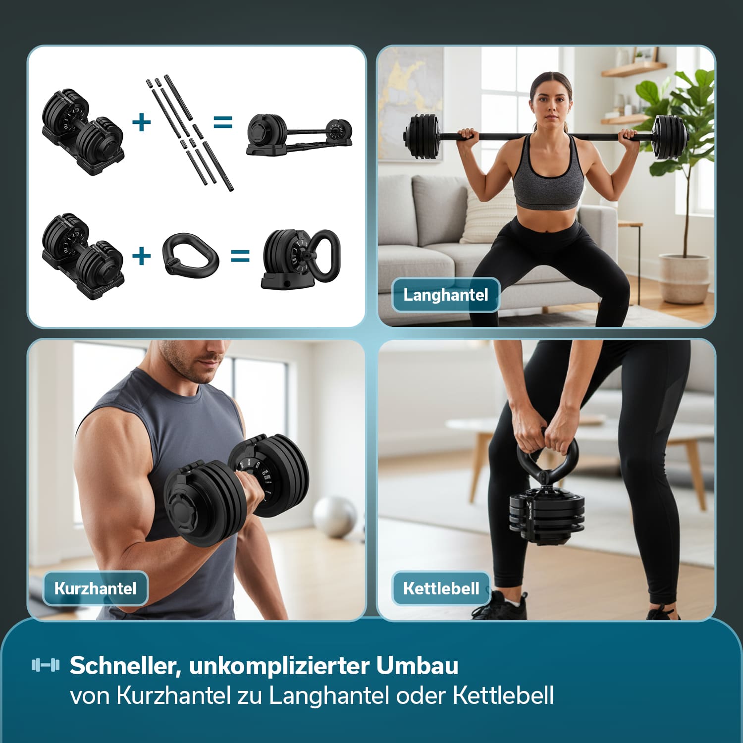 Cet ensemble combine haltères courts, haltères longs et kettlebells dans un système compact. Les exercices d'isolation classiques tels que les flexions des biceps, les exercices composés à deux mains tels que le développé couché et l'entraînement fonctionnel avec des swings sont possibles avec un seul ensemble de poids.