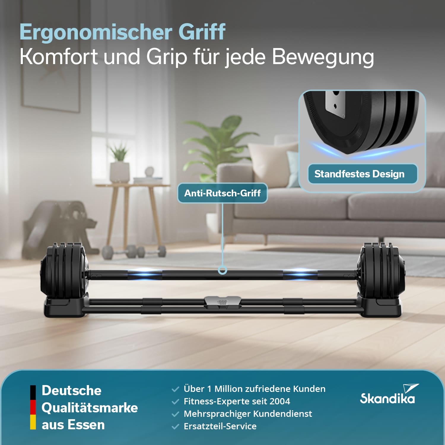 Avec le set d'haltères 3-en1 Paino de Skandika, votre salle de sport à domicile devient une station de musculation à part entière. Ce set d'entraînement innovant combine trois appareils d'entraînement essentiels en un seul système compact, offrant ainsi une polyvalence maximale dans un espace minimal. Les disques de poids fournis peuvent être utilisés au choix comme haltères courts, haltères longs ou kettlebells, ce qui permet de réaliser presque tous les exercices de musculation. Grâce à son système intelligent de changement rapide avec technologie d'auto-verrouillage et à ses 12 niveaux de poids par configuration, cet ensemble permet un entraînement progressif et varié pour tous les niveaux de performance.