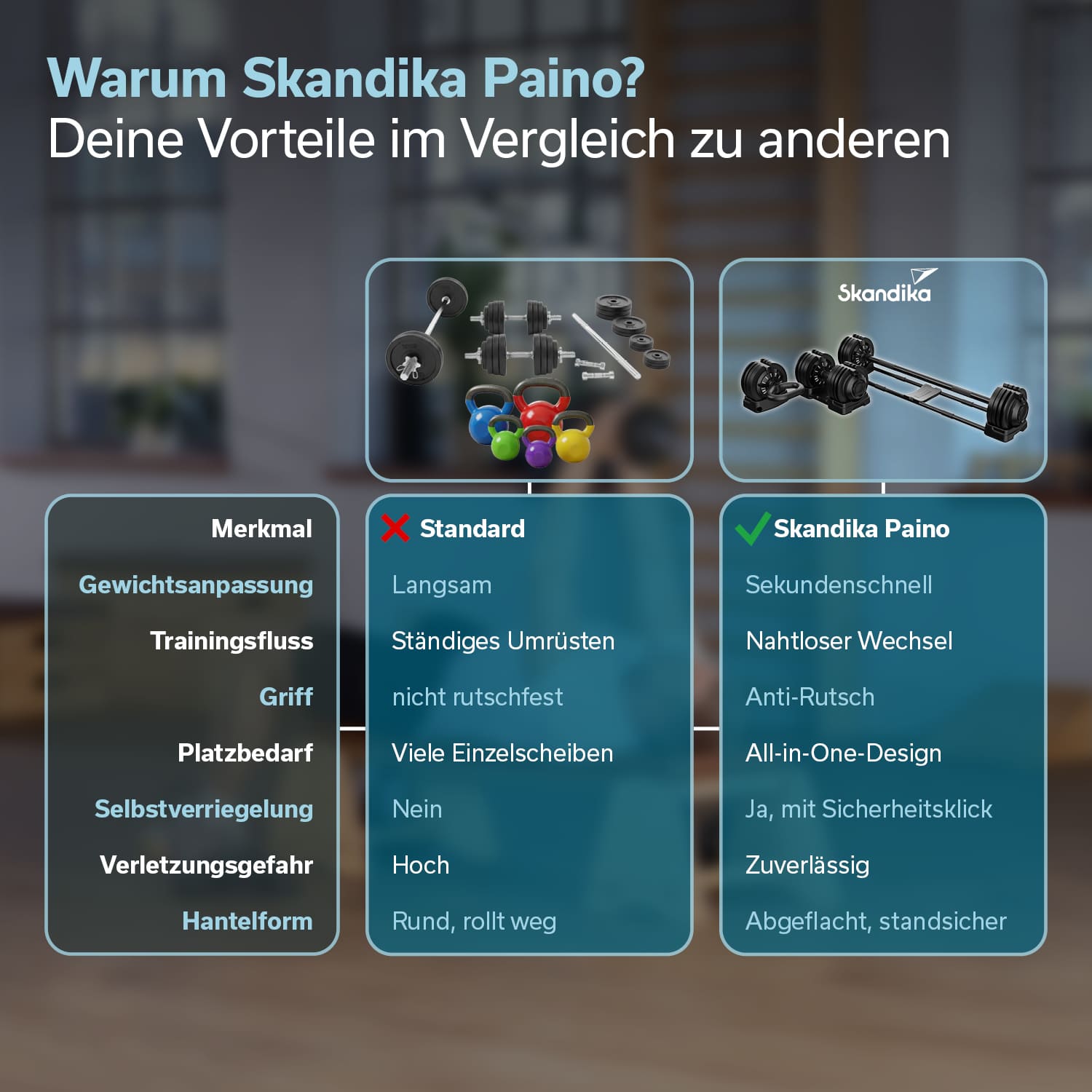 Le set 3 en 1 fait partie de la gamme complète Paino de Skandika, qui comprend différents haltères, un set d'haltères et un kettlebell. Cette gamme coordonnée offre de nombreuses possibilités d'entraînement à domicile.