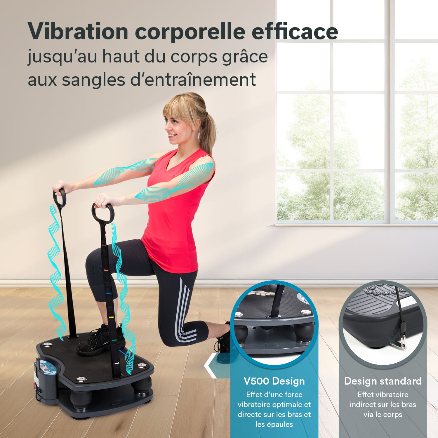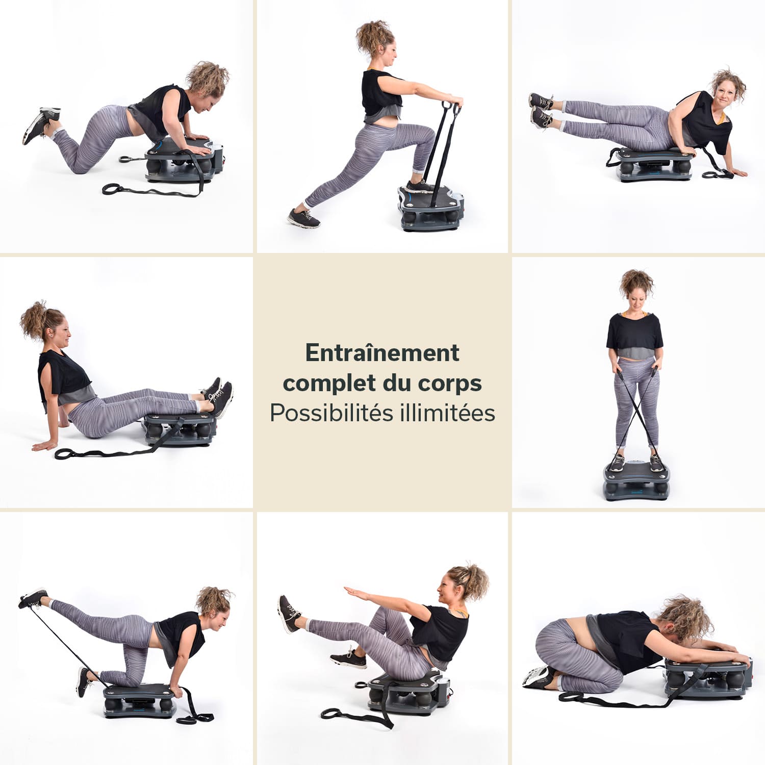 L'entraînement intensif par vibrations améliore l'endurance, réduit les zones à problèmes, favorise la circulation sanguine et augmente la musculature. En même temps, il permet de raffermir la peau. Si des bandes d'entraînement sont intégrées à l'entraînement, il en résulte un entraînement très efficace de tout le corps.