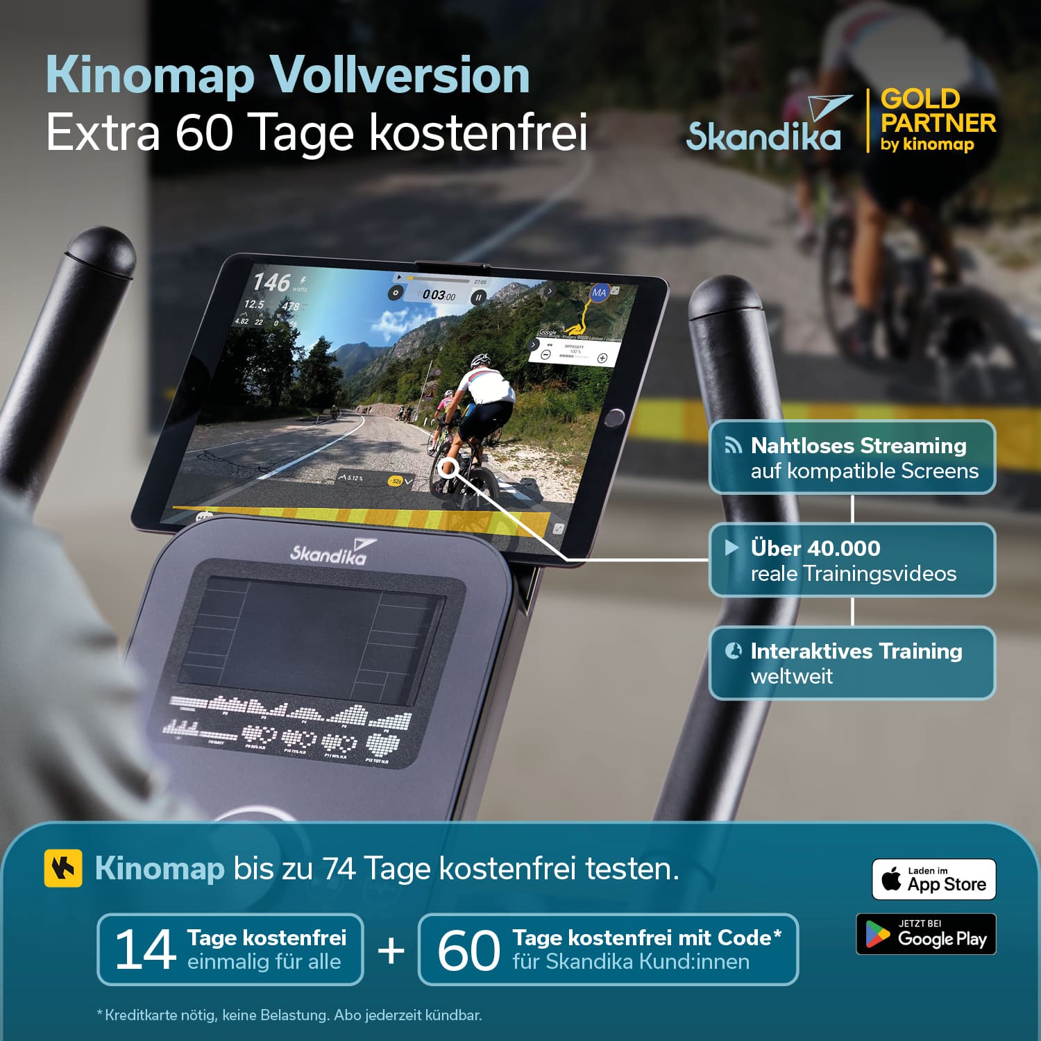 La fonction Bluetooth intégrée permet de se connecter à des applications de fitness telles que Kinomap, les clients Skandika bénéficiant d'un accès gratuit à la version complète de Kinomap pendant 60 jours.
