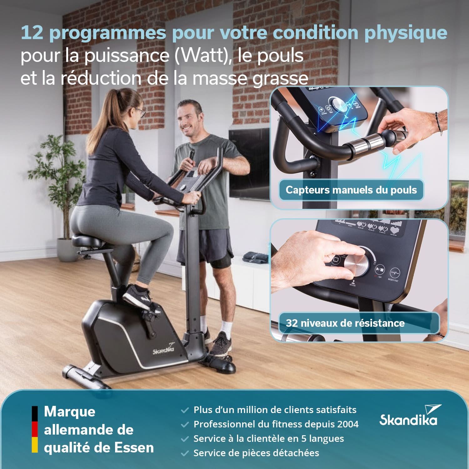Le vélo d'appartement ergomèrte Skandika Cykling P10 allie une technologie de pointe à un design convivial pour un entraînement cardio efficace à domicile. Avec ses équipements polyvalents et son design compact et élégant, cet appareil de fitness performant offre les conditions optimales pour un entraînement ciblé et motivant.