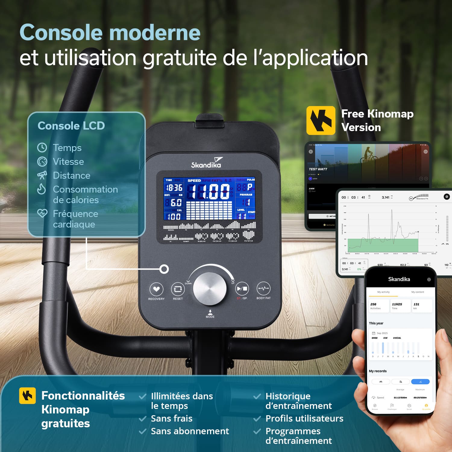 La fonction Bluetooth intégrée permet de se connecter à des applications de fitness telles que Kinomap, les clients Skandika bénéficiant d'un accès gratuit à la version complète de Kinomap pendant 60 jours.