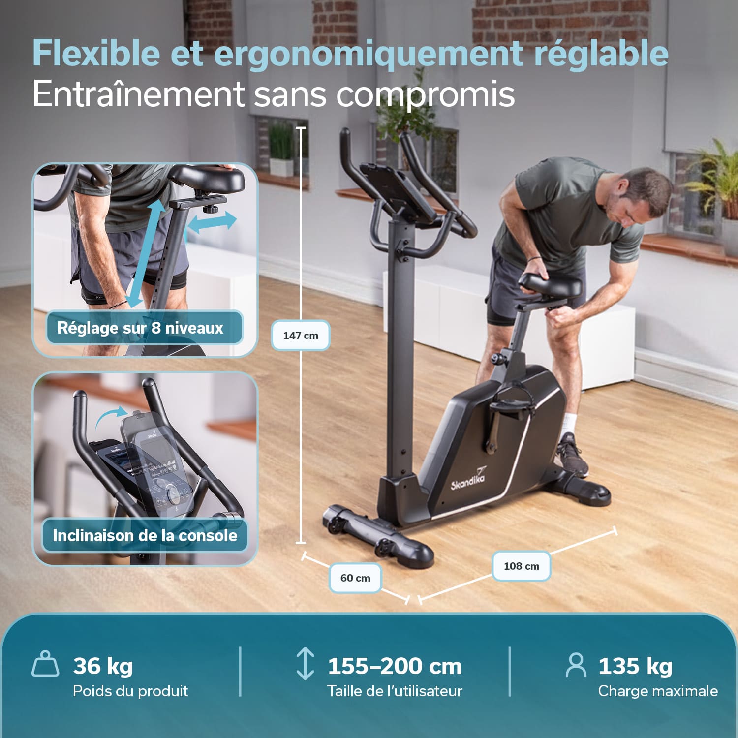 L'ergomètre est conçu pour un poids maximal de 135 kg et convient aux personnes mesurant entre 155 cm et 200 cm, ce qui lui permet de s'adapter à un large éventail d'utilisateurs.