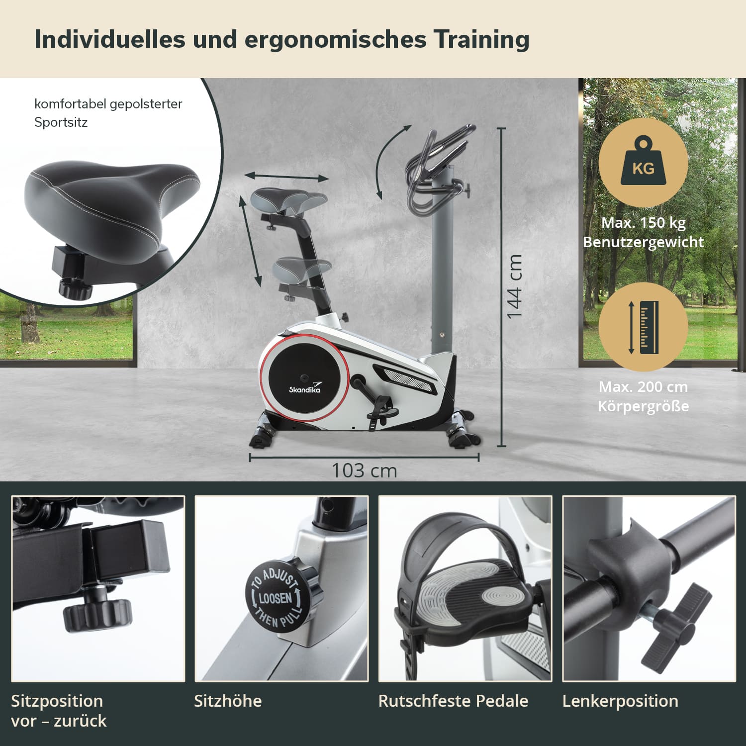 La construction robuste de l'ergomètre est en acier et en aluminium de haute qualité et peut supporter des sportifs pesant jusqu'à 150 kg. Avec ses dimensions de 103 × 56 × 144 cm, le vélo d'appartement reste suffisamment compact pour être utilisé dans le salon, mais permet une taille maximale de 200 cm pour l'utilisateur.
