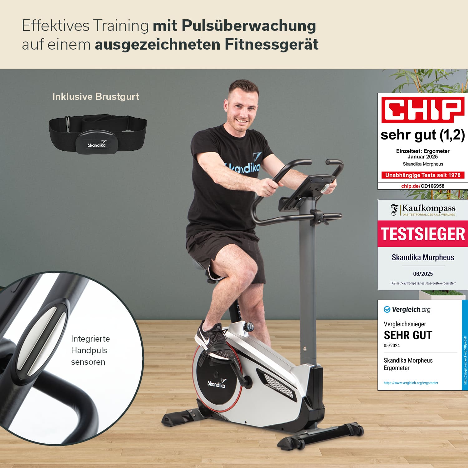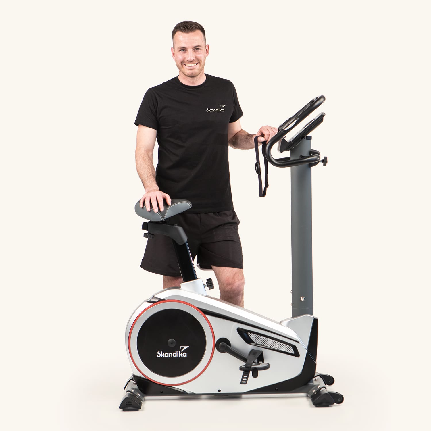 - Selle rembourrée confortable, capteurs de pouls intégrés au guidon, roulettes de transport, ceinture thoracique Skandika