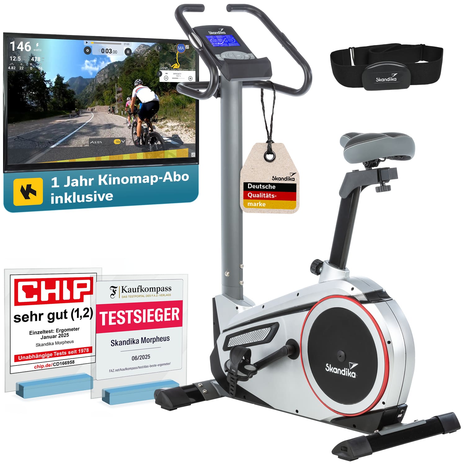 Depuis des années, l'ergomètre Skandika Morpheus aide nos clients à être en meilleure santé et en meilleure forme physique. Le vélo d'appartement fait travailler de nombreux groupes musculaires, ce qui entraîne une dépense calorique élevée. Des séances d'entraînement régulières peuvent ainsi contribuer à la perte de poids et au développement musculaire, lutter contre les maux de dos, l'hypertension et le diabète, et améliorer la forme physique et la santé en général. L'ergomètre Morpheus, vendu avec un abonnement annuel à Kinomap, est destiné à tous ceux qui recherchent la polyvalence, des dimensions compactes et un excellent rapport qualité-prix pour leur entraînement.