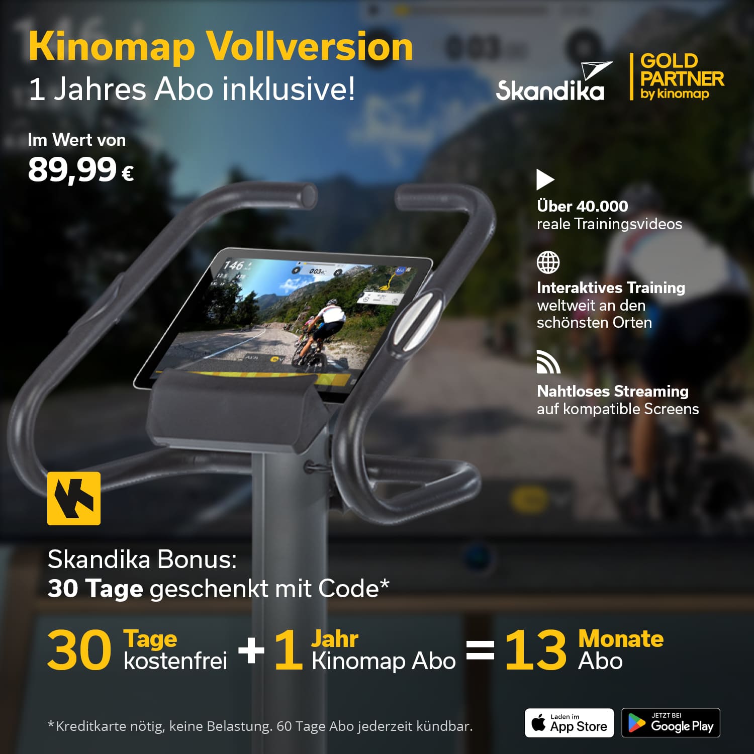 - Abonnement d'un an à Kinomap d'une valeur de 89,99 € inclus, avec 30 jours supplémentaires d'essai gratuit.