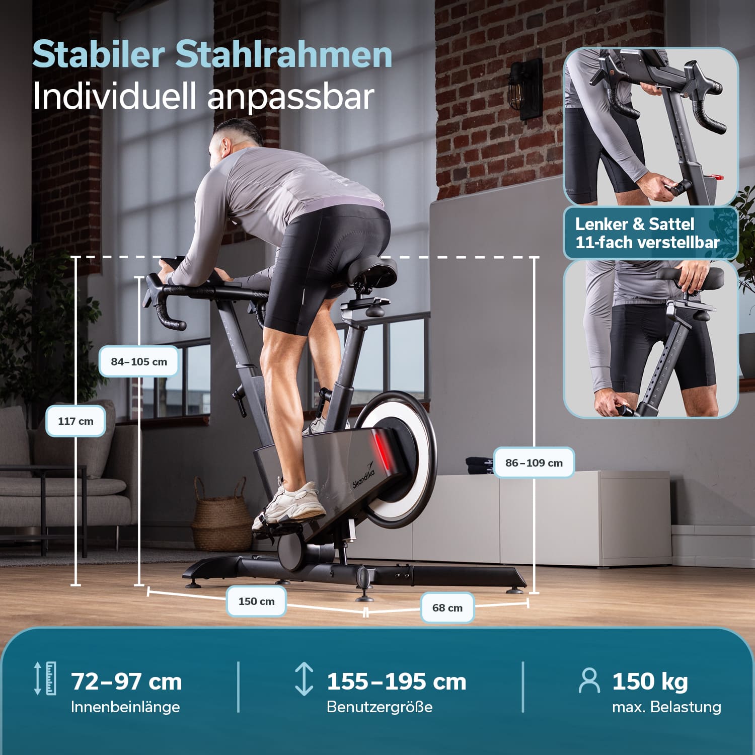 La selle et le guidon sont réglables en hauteur sur 11 positions, la selle pouvant en outre être réglée horizontalement en continu. L'appareil convient pour des longueurs d'entrejambe de 72 à 97 cm. De plus, nous recommandons une taille comprise de 155 à 195 cm environ pour une utilisation particulièrement agréable et ergonomique.