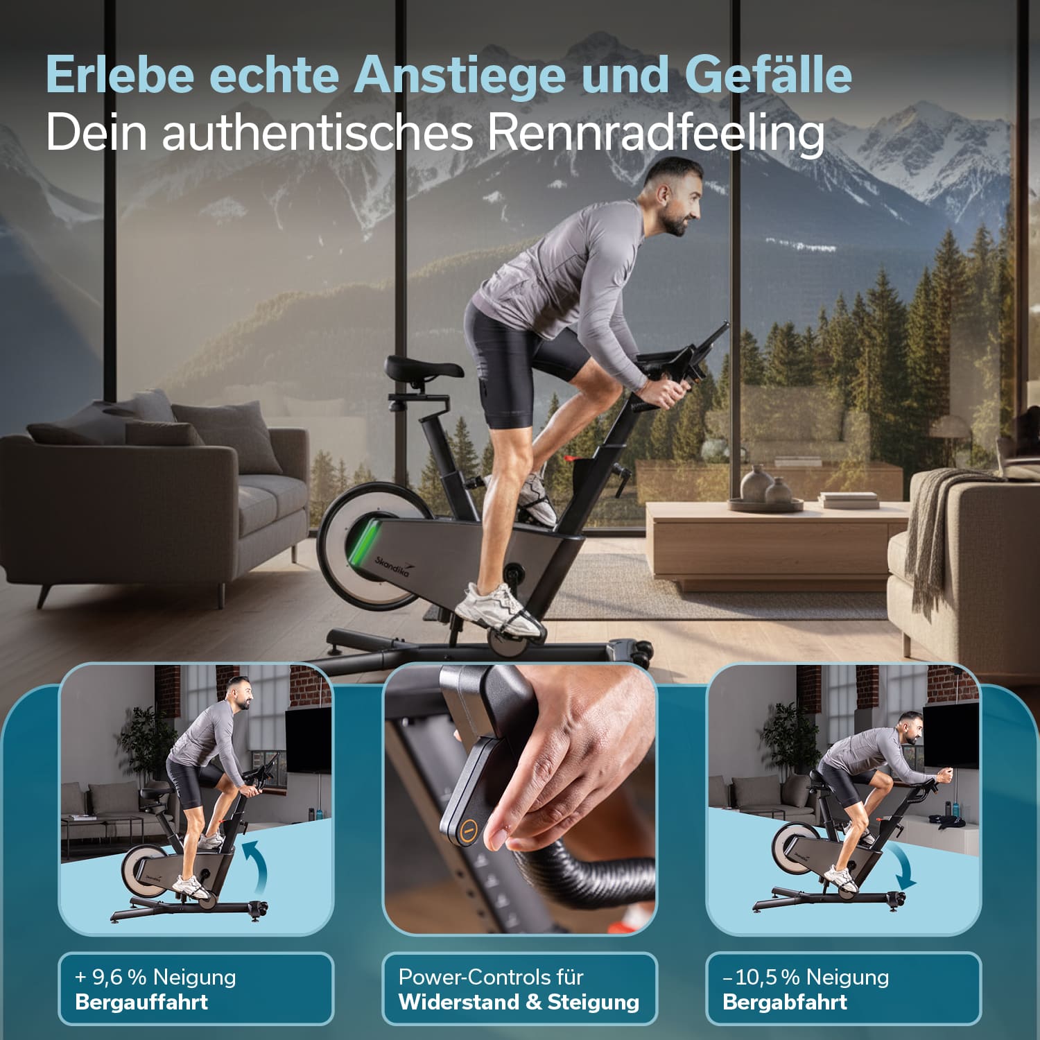 Le vélo de biking Skandika Speedbike Kliva 800-S séduit par sa puissance d'entraînement pouvant atteindre 800 watts et élève le cyclisme en salle à un tout autre niveau. Sa particularité : ce vélo de vitesse intelligent simule non seulement des montées et des descentes de manière virtuelle grâce à la résistance, mais il bouge également réellement. Le moteur de montée intégré incline l'ensemble du vélo vers l'avant et vers l'arrière, créant ainsi une sensation de conduite authentique qui se rapproche plus que tout autre vélo d'intérieur de l'entraînement réel sur route.