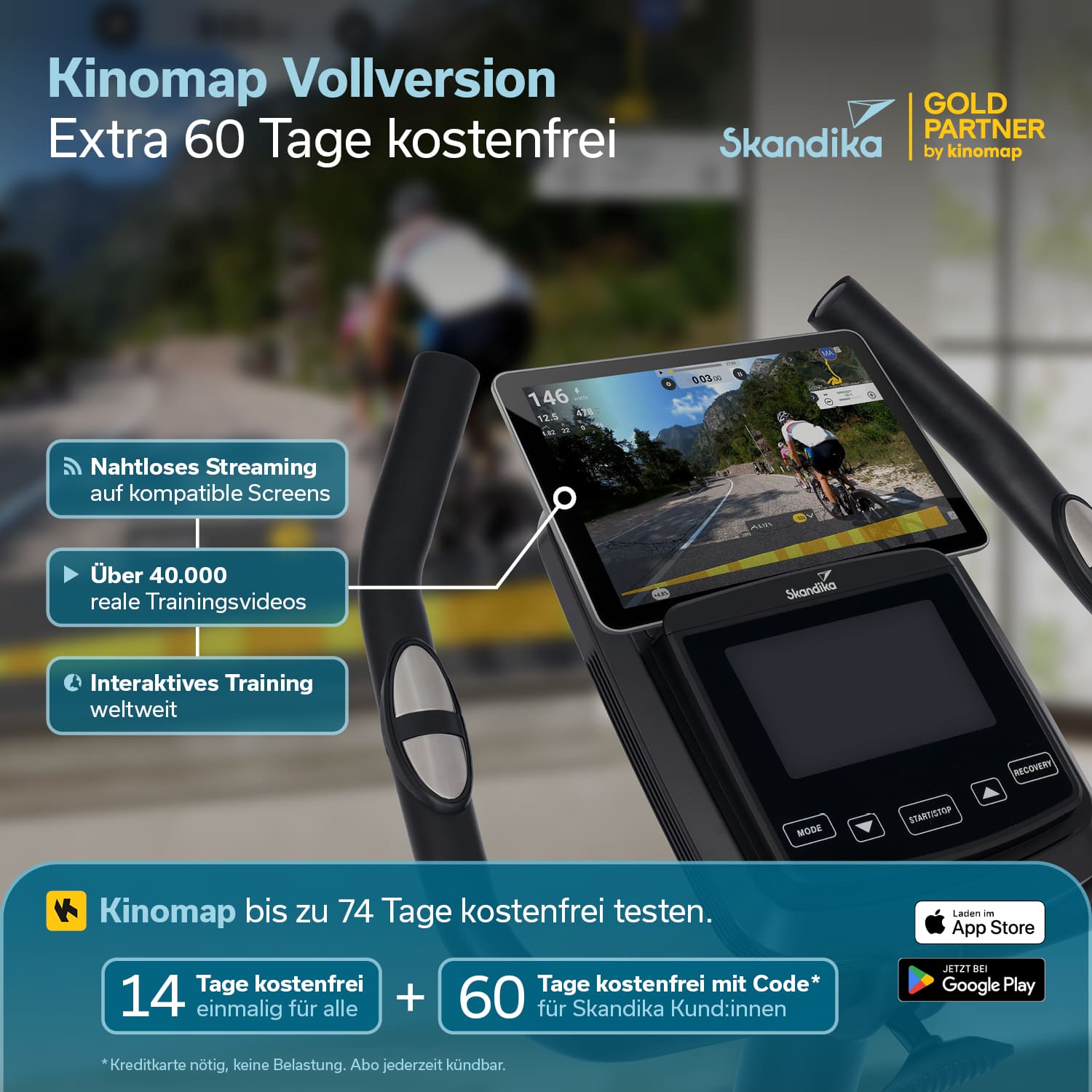 Grâce au partenariat Gold avec Kinomap, les clients Skandika reçoivent un code leur permettant de tester gratuitement pendant 60 jours la version complète de l'application Kinomap. Des vidéos en direct, des coachings et des vidéos d'entraînement virtuelles font passer chaque séance d'entraînement à un niveau supérieur.