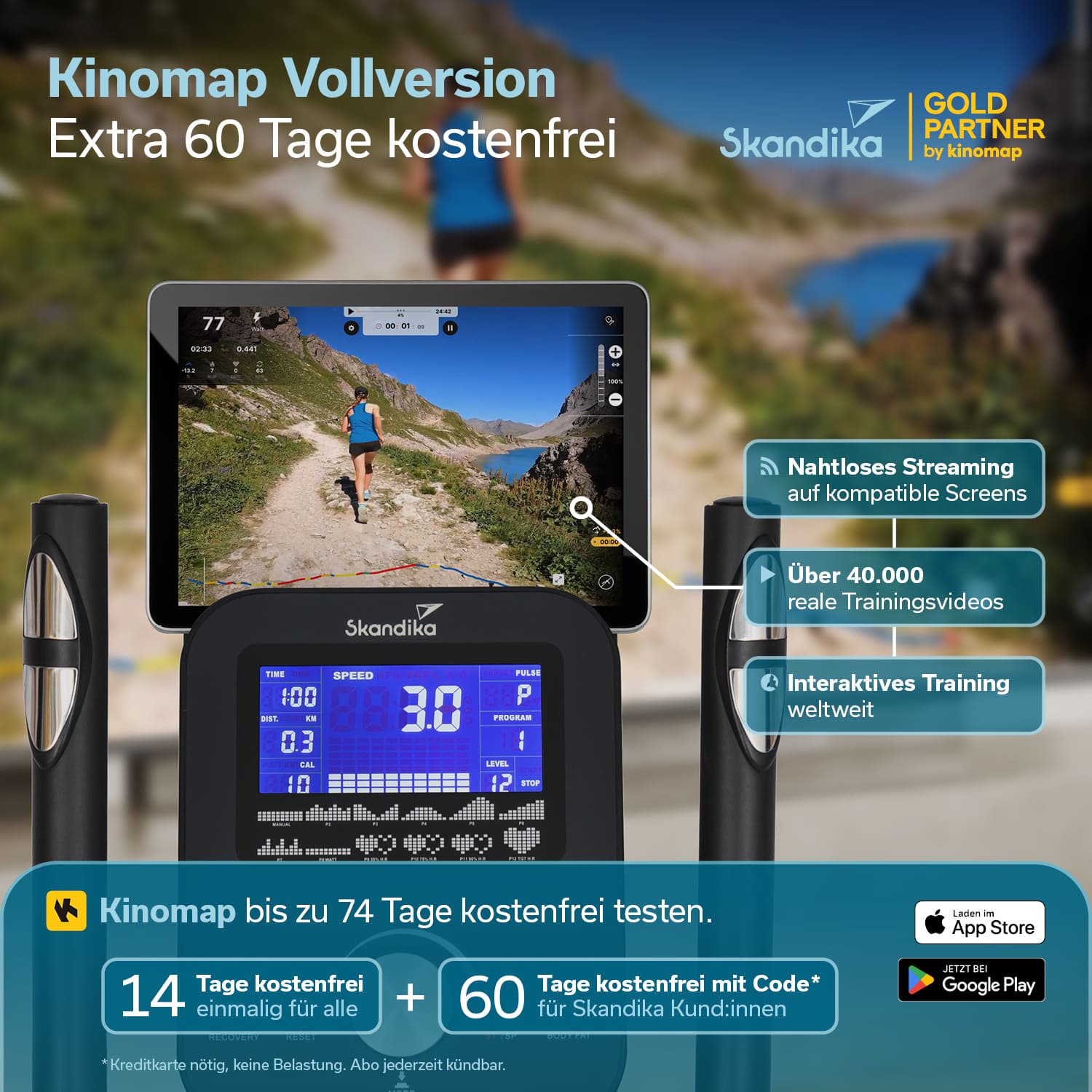 Les clients Skandika bénéficient d'un accès gratuit pendant 60 jours à la version complète de l'application Kinomap, qui propose des vidéos en direct, des coachings et des vidéos d'entraînement virtuelles dans les plus beaux endroits du monde.